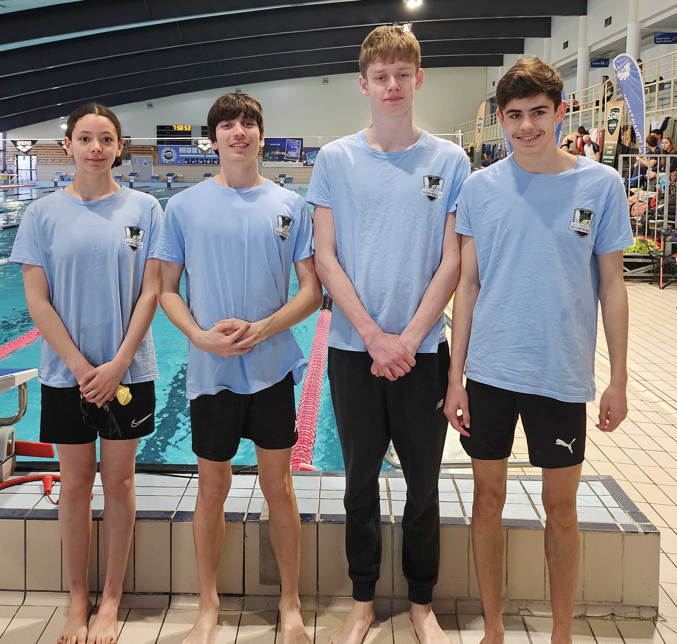 Une nageuse et trois nageurs représentés le club de Pierrelatte : Maysam Touili, Jayden Balandreau, Gabriel Perrot Soler et M…
